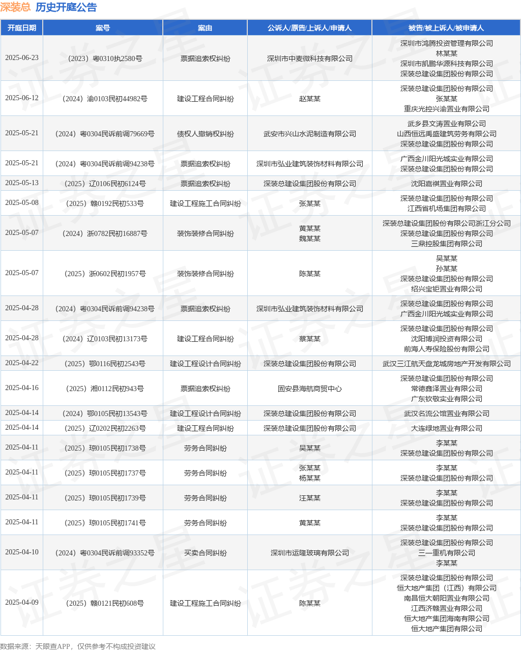 案号:(2025)辽0106民初6124号审理法院:沈阳市铁西区人民法院案由:票据追索权纠纷当事人信息: 原告/上诉人:深装总建设集团股份有限公司 被告/被上诉人:沈阳嘉祺置业有限公司开庭日期:2025年5月13日根据统计,近一年内以深装总建设集团股份有限公司为当事人的历史开庭公告有132则,其中案由为“建设工程分包合同纠纷”的公告以20则居首,其次为“票据追索权纠纷”有15则,“建设工程施工合同纠纷”有13则。历史开庭公告(前20条)如下: